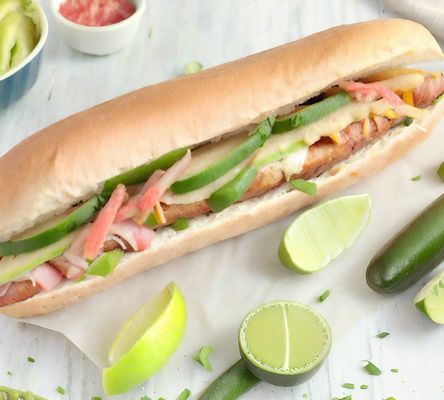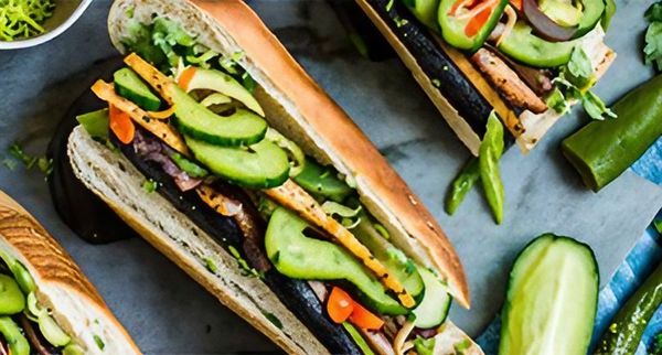 Vegan baguette roll with glazed tofu, onion, and traditional pickled vegetables.