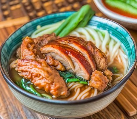 Loaded noodle salad with crispy pork belly and traditional toppings.