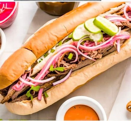 Succulent, fall-apart tender juicy braised beef served on a crusty Vietnamese-style French baguette lathered with creamy homemade mayo, soy sauce, pickled carrots, daikon, cucumber and fresh coriander.