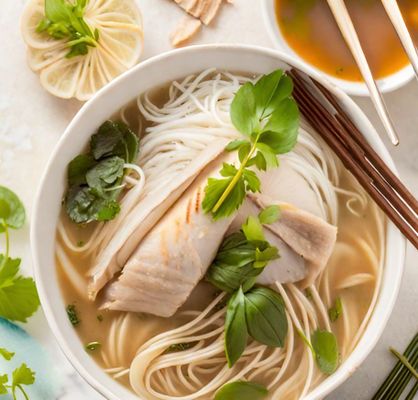Crispy Skin Chicken Phở A hearty bowl of phở with rice noodles in a slow-simmered pork-infused broth, topped with crispy crackling pork belly. Served with pickled vegetables, bean sprouts, fresh herbs, lime, and classic dipping sauces.