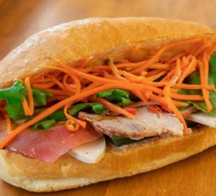 BBQ pork, Vietnamese ham served on a crusty Vietnamese-style French baguette lathered with creamy homemade mayo, pate, soy sauce, pickled carrots, daikon, cucumber and fresh coriander.