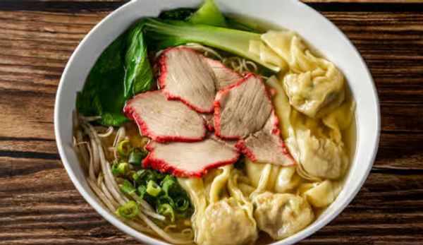 Egg noodle soup with BBQ pork and pork wontons in broth.